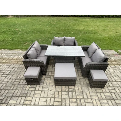General description This deluxe rattan sofa rising dining table set is an excellent addition to your patio or garden. Made of high-quality PE rattan and durable galvanized steel construction, it offers sturdiness and longevity, making it suitable for outdoor use all year round. The table can be used as both a coffee and dining table, providing versatility at a competitive price compared to other stores. Technical specifications Big footstool dimensions: 65L x 65W x 34H cm Small footstool dimensions (2 pieces): 40L x 40W x 34H cm Love sofa dimensions: 124W x 67D x 79H cm Lifting rising table dimensions: 140L x 80W x 68/48H cm (height adjustable between 68 cm and 48 cm) Material: Dark grey mixed rattan with dark grey fabric Seat cushion thickness: 8 cm Glass top: 5 mm thickness clear tempered glass with suckers to prevent sliding Installation The items come flat-packed and require self-assembly. Please ensure to check the product carefully upon delivery for any obvious damage before