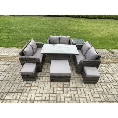 General description This deluxe rattan sofa rising dining table set is a great addition to your patio or garden. Made of high-quality PE rattan and durable galvanized steel construction, it offers sturdiness and long-lasting durability, allowing it to be placed outdoors all year round. The table can be used both as a coffee table and a dining table, providing versatility at a competitive price compared to other stores. Technical specifications 1 x Side coffee table: 65L x 65W x 66H cm 1 x Big footstool: 65L x 65W x 34H cm 2 x Fully assembled small footstools: 40L x 40W x 34H cm 3 x Love Sofa: 124W x 67D x 79H cm 1 x Lifting rising table: 140L x 80W x 68/48H cm (height adjustable: up to 68 cm, down to 48 cm) Color: Dark grey mixed rattan with dark grey fabric (color may vary due to lighting or monitor settings) Material: Flat PE rattan, 5mm thickness clear tempered glass with suckers on the surface to prevent sliding Seat cushion thickness: 8 cm Installation Items come flat-packed;