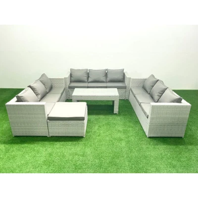 Rattan Garden Outdoor Furniture Set 10 Seater Sofa Oblong Coffee Table with Big Footstool Light Grey Mixed Fimous