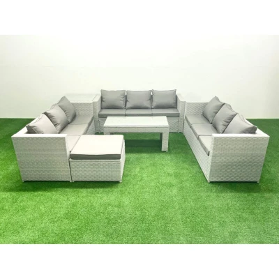 Rattan Garden Outdoor Furniture Set 10 Seater Sofa Oblong Coffee Table with Big Footstool Side Light Grey Mixed Fimous