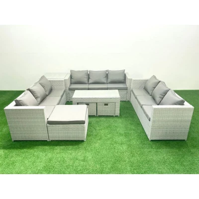 Rattan Garden Outdoor Furniture Set 12 Seater Sofa Oblong Coffee Table with 3 Footstools Side Light Grey Mixed Fimous