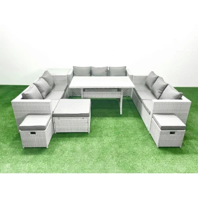 Rattan Garden Outdoor Furniture Set 12 Seater Sofa Rectangulr Dining Table with 3 Footstools Side Light Grey Mixed Fimous