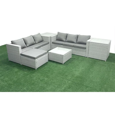 Rattan Garden Outdoor Furniture Set 7 Seater Sofa with Big Footstool 2 Side Tables Light Grey Mixed Fimous