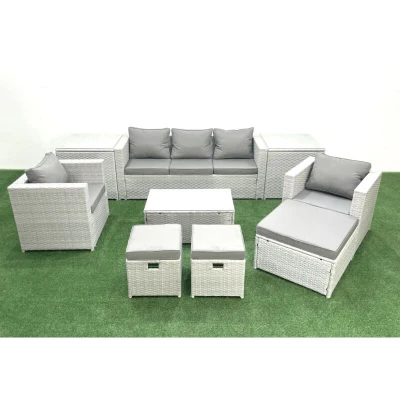 Rattan Garden Outdoor Furniture Sofa Set with Rectangular Coffee Table 2 Chairs 3 Footstools Side Tables Light Grey Mixed Fimous