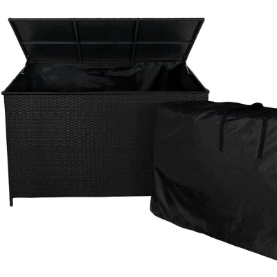General description Transform your outdoor living space with our black rattan garden storage box - an essential addition for ultimate organization that effortlessly blends style and functionality. The robust powder-coated steel frame, complemented by a stunning UV resistant black rattan finish, ensures unmatched durability while establishing a modern and sophisticated outdoor aesthetic. Boasting a generous 582L capacity, this thoughtfully crafted chest serves as the ideal accompaniment to your outdoor furniture, providing comfortable housing for all the cushions and protecting them during colder, rainier months. Technical specifications Colour: Black Weight: 19.6 kg Box Material: Rattan Frame Material: Powder Coated Steel Bag Material: Oxford Height: 80 cm / 0.8 m / 31.5” Width: 138 cm / 1.38 m / 54.3” Depth: 70 cm / 0.7 m / 27.6” Capacity: 582 L Internal Box Dimensions: 132 cm W x 63 cm D x 70 cm H Storage Bag Dimensions: 125 cm W x 67.5 cm D x 63 cm H UV Resistant: Yes Compatibility