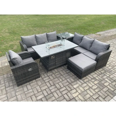 General description This Fimous Rattan Outdoor Furniture set includes a gas fire pit, a rectangle dining table, reclining chairs, a three-seater sofa, a big footstool, and a side table, designed for outdoor enjoyment. The set features dark grey mixed rattan with dark grey fabric, providing a stylish and comfortable seating arrangement for up to 8 people. The adjustable armchairs allow you to customize your seating position from 90° to 130° for added comfort. Technical specifications Set dimensions: Side table: 65L x 65W x 66H cm Big footstool: 65L x 65W x 34H cm 3 Seater sofas (2): 177W x 67D x 79H cm Reclining chairs (1): 74L x 67W x 79H cm Firepit table: 140L x 80W x 69H cm Material: Flat PE rattan, 5mm thick transparent tempered glass, galvanized steel tube frames with powder coating Cushion thickness: 8 cm Installation Items come flat packed and are easy to assemble. Usage Place the gas fire pit on the glass top, not under it. Do not cover the igniter with lava rocks. Check for