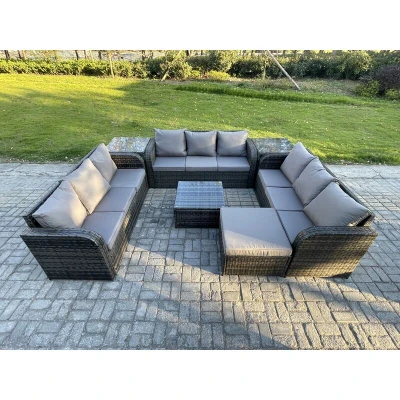 Rattan Outdoor Furniture Set Patio Garden Sofa with Square Coffee Table Big Footstool 2 Side Tables Dark Grey Mixed Fimous