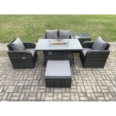 General description This Fimous Rattan Outdoor Garden Furniture Set features a gas fire pit dining table, side table, chairs, love seat sofa, and footstool, designed for comfort and style in your outdoor space. The set is made from dark grey mixed rattan with dark grey fabric, providing a modern aesthetic. The adjustable armchairs allow you to customize your seating position from 90° to 130° for optimal relaxation. Technical specifications Set dimensions: Side table: 65L x 65W x 66H cm Big footstool: 65L x 65W x 34H cm Love sofa: 124W x 67D x 79H cm Reclining chairs (2): 74L x 67W x 79H cm Firepit table: 140L x 80W x 69H cm Material: Flat PE rattan, 5mm thick tempered glass Cushion thickness: 8 cm Installation Items come flat packed and are easy to assemble. Sturdy galvanized steel tube metal frames with powder coating to prevent rust. Usage Place the gas fire pit on the glass top, not under it. Do not cover the igniter with lava rocks. Check for gas leaks at the joints and hose
