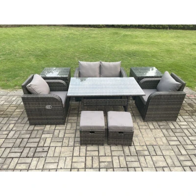 Rattan Outdoor Garden Furniture Set Rectangular Dining Table and Chair Sofa With 2 Side Tables Small Footstools Dark Grey Mixed Fimous