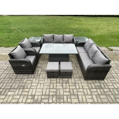 General description This deluxe reclining rattan sofa set is a great addition to your patio or garden. Made of high-quality PE rattan and durable galvanized steel construction, it offers sturdiness and longevity, making it suitable for outdoor use all year round. This set is perfect for gathering with family and friends. Technical specifications Set Dimensions: 2 x Side coffee table: 65L x 65W x 66H cm 2 x Small Fully Assembled Footstool: 40L x 40W x 34H cm 2 x 3-seater Sofa Size: 177W x 67D x 79H cm 2 x Reclining Chairs: 74L x 67W x 79H cm 1 x Lifting Rising Table: 140L x 80W x 68/48H cm (height adjustable from 68 cm to 48 cm) Color: Dark grey mixed rattan with dark grey fabric Seat Cushion Thickness: 8 cm Armrest Width: 9 cm Glass Thickness: 5 mm clear tempered glass Installation Items come flat packed and are easy to assemble. Sturdy galvanized steel tube metal frames with powder coating to prevent rust. Usage The table can be used as both a coffee and dining table. The reclining