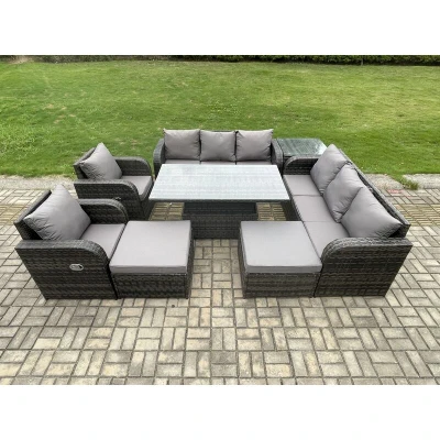 General description This deluxe reclining rattan sofa set is a great addition to your patio or garden, made of high-quality PE rattan and durable galvanized steel construction for sturdiness and long-lasting durability. It can be placed outdoors all year round, making it perfect for gatherings with family and friends. Technical specifications Set Dimensions: 1 x Side coffee table: 65L x 65W x 66H cm 2 x Big footstools: 65L x 65W x 34H cm 2 x 3-seater sofas: 177W x 67D x 79H cm 2 x Reclining chairs: 74L x 67W x 79H cm 1 x Lifting rising table: 140L x 80W x 68/48H cm (height adjustable from 68 cm to 48 cm) Color: Dark grey mixed rattan with dark grey fabric Seat cushion thickness: 8 cm Armrest width: 9 cm Glass thickness: 5 mm (clear tempered glass) Installation Items come flat packed and are easy to assemble. Sturdy galvanized steel tube metal frames with powder coating to prevent rust. Usage The reclining chairs are adjustable, allowing you to change the backrest inclination from 90°