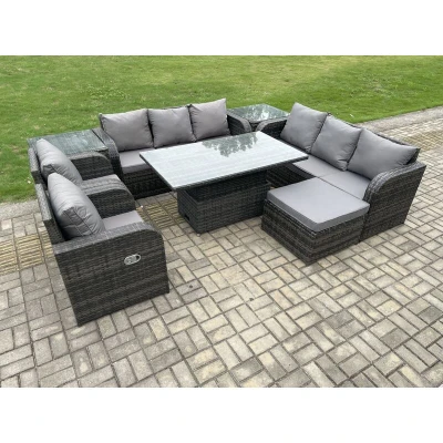 Rattan Outdoor Garden Furniture Sets Height Adjustable Rising lifting DiningTable Sofa Set with Reclining Chair 2 Side Table Big Footstool Dark Grey