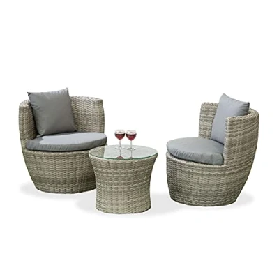 Made from an all weather synthetic wicker the GSD Bottle Set is ideal for patios and balconies thanks to its compact size. The furniture can be stored outdoors all year round thanks to the UV resistant material This means that the resin will not fade or dry out over time. T The set can also be stacked, with the table sitting neatly on top of the two interlinking chairs A great solution for small storage spaces. No assembly needed as it comes ready built Dimensions: Table: 49cm x 46cm (H x Dia.) Chair: 76cm x 72cm x 72cm (H x W x L) Cushions 6cm Thick Total height of set 114cm Weight: 22.4kg Warranty: 1 year manufacturers warranty