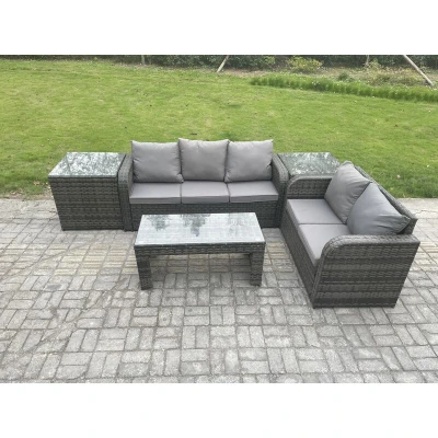 General description This outdoor rattan lounge sofa set is an excellent addition to your patio or garden. It is made of high-quality PE rattan and features a durable galvanized steel construction, ensuring sturdiness and longevity. This set is designed for outdoor use all year round, making it perfect for gatherings with family and friends. Technical specifications 2 x Side coffee table: 65L x 65W x 66H cm 1 x Love Sofa: 124W x 67D x 79H cm 1 x 3-seater Sofa: 177W x 67D x 79H cm 1 x Oblong Coffee table: 105L x 50W x 48H cm Material: Dark grey mixed rattan with dark grey fabric Seat cushion thickness: 8 cm Glass thickness: 5 mm tempered glass Installation Items come flat packed and are easy to assemble. The furniture features sturdy galvanized steel tube frames with powder coating to prevent rust. Usage This furniture set is low maintenance, with removable cushion covers for easy cleaning. It is recommended to keep the cushions indoors or use a rain cover when not in use. To prolong