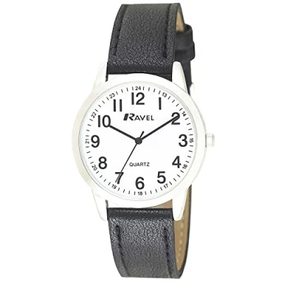 A clear 1-12 dial with dotted minute track, stylish hands and numbers in a modern round silver tone case. Perfect for casual everyday wear. The silver tone case is fitted with a black faux leather strap for functionality and comfort. Case Size 36mm. Minimum strap length is 155mm, maximum strap length is 205mm Fitted with a quality Singapore Quartz movement with replaceable Japanese battery that is easily replaced. All Ravel watches are fitted with battery protectors on the watch crown to save battery life. 12 Month's Manufacturers Guarantee