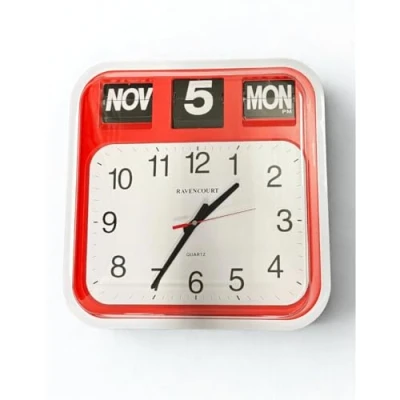 Ravencourt Large Flip Calendar Wall Clock, Office Public Sector Style, Easy Read, High Contrast Clock Face, Dementia Care, size 42cm x 44cm c 10cm (Red)