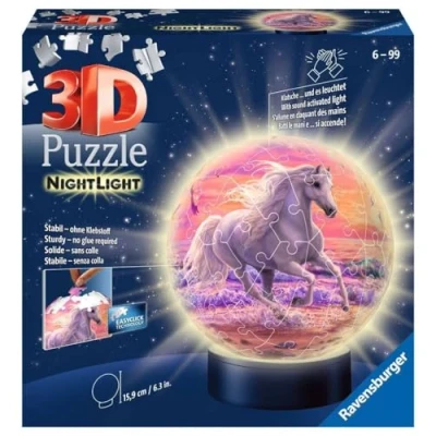 Puzzles in the third dimension. The ideal gift idea for all horse fans aged 6 and over. High-quality plastic parts with Easyclick technology for precise cohesion - stable, without adhesive Made from 72 high-quality plastic puzzle pieces and 2 accessories, a sturdy puzzle ball is created piece by piece, which serves as a practical night light. Can be easily illuminated even in the dark thanks to the clap switch An eye-catcher in any children's room and a wonderful decoration for the bedside table or desk of all horse fans. The ideal gift for a birthday or Christmas Difficulty level 2/5, height approx. 15.9 cm, width approx. 12.9 cm; batteries not included; LED module requires 3 x 1.5 V AA/LR6 batteries International products have separate terms, are sold from abroad and may differ from local products, including fit, age ratings, and language of product, labeling or instructions., Manufacturer: Ravensburger