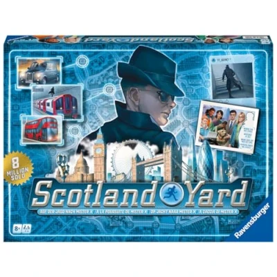 The well-known hide-and-seek game around Mister X and the detectives in London - game and fun guaranteed! Now in a new design and individual character figures! On our website you can upload your photos and print a template. So you can use your own detective, detective, Ms. X or Mister X! For 2-6 players aged 8 and up, playing time: 45 minutes Now with 6 additional toy figures! Join the team now – either turn into one of the included characters, or print yourself as a template on the website. Scotland Yard wants to catch Mister X before it's too late, while Mister X gives everything to escape. Use taxi, bus and underground tickets to take on the hunt across London! But only if you work well together, you can grab Mister X! 1 game plan, 12 toy figures, 29 starting cards, 130 tickets, 3 double train tickets, 12 ticket boards, 1 ride board, 1 viewing screen, 2 rings for the bobbies, instructions (D, F, I, NL), Manufacturer: Ravensburger