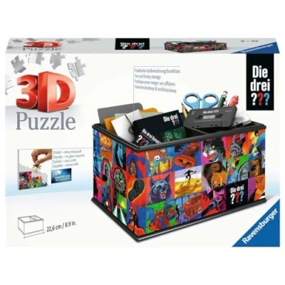Puzzles in the third dimension! The perfect gift idea for real "Die drei ? ??" Fans aged 8 and up. High-quality plastic parts with Easyclick technology for precise cohesion - stable, without glue From 216 high-quality plastic puzzle pieces and 7 accessories, a practical chest is created piece by piece - a real eye-catcher, perfect decoration and practical storage in one The ideal activity with guaranteed success - thanks to illustrated, coloured instructions and numbered puzzle pieces. After assembly, the chest serves as a practical storage for all sorts of desk accessories Whether for boys or girls, children or adults - 3D puzzle fun and a practical storage aid for real "Die drei ? ??" Fans and those who want to become one Difficulty level 2/5; dimensions of the assembled storage box approx. 22.6 x 15.5 x 13.5 cm (L x W x H), Manufacturer: Ravensburger Spieleverlag