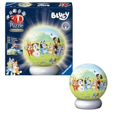 A 72 piece Bluey puzzle ball, with nightlight stand included! Bestselling 3D puzzle brand worldwide - Our 3D jigsaw puzzles make ideal gifts for boys and great gifts for girls. This product is made from high quality plastics and of FSC-certified and other controlled material. By choosing this product, you are supporting responsible management of the world’s forests. Contents: 72 three-dimensional puzzle pieces, 1 LED light base; difficulty level 2/5; height approx. 15.5 cm, width approx. 13 cm; power supply via 3x 1.5V AA/LR6 batteries or USB-C cable (not included) Puzzle fun with guaranteed success: The high-quality, dimensionally stable plastic puzzle pieces are numbered and fit together perfectly thanks to Easyclick Technology – without any glue. With illustrated instructions The light module has 2 brightness levels and is very easy to use: simply place the finished Puzzle-Ball on the base and press down. Works wirelessly with batteries or via the integrated USB-C connection + power outlet, Manufacturer: Ravensburger