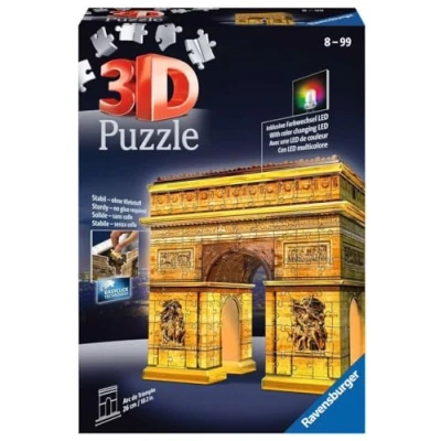Utilising the latest 3D puzzle technology you can create this stunning 3D model of Paris' Arc De Triomphe Night Edition with stunning LED lighting effects. No glue required! Bestselling 3D puzzle brand worldwide - Our 3D jigsaw puzzles make ideal gifts for boys and great gifts for girls. The Ravensburger Night Edition Arc de Triomphe 3D building jigsaws are crafted with premium quality and when completed are 28cm high. Great 3D puzzles for Children 8 years old and up. This puzzle uses unique plastic pieces, which slot together to build a sturdy and strong model. Either assemble by eye or using the numbers on the reverse side. Positively Puzzling - From fun family times together to long term health benefits and day-to-day mindful moments, jigsaw puzzles make a great birthday present or Christmas gift., Manufacturer: Ravensburger