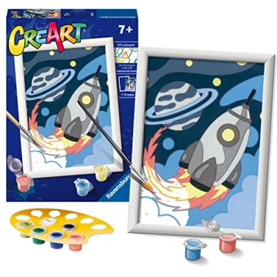 This colourful space explorers painting by numbers activity is sure to relax and satisfy you, as each section is completed with a lick of paint - excellent arts and crafts for kids. This colourful painting by numbers activity is a great way to relax away from screens and makes an excellent craft activity for kids. This craft kit includes; high quality thick painting canvas, 10 acrylic paints in numbered pots, premium palette to hold the pots, fine point durable paintbrush for detail painting, easy to follow guide sheet and a sturdy presentation frame to display finished artwork. CreArt paint by numbers sets make a fantastic Christmas or birthday gift or Easter craft activity for ages 7 years and up. This product is made of FSC-certified and other controlled material. Canvas size measures 24 x 18 cm., Manufacturer: Ravensburger