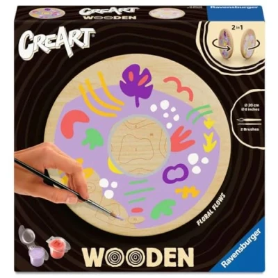 CREATIVE ACTIVITY FOR ADULTS This complete kit allows you to create a beautiful painting on WOOD thanks to paint by numbers. This visual foral, painting on both sides and its round format with a diameter of 20 cm offer it a real trendy look! A cotton cord and screws are included for hanging. Everyone can be an artist with paint by numbers! Paint step by step with numbered paint fields and create a real masterpiece. You will be proud to reveal your achievement! Relaxation and relaxation Away from the screens, painting by numbers invites you to relax and disconnect from your daily life by promoting concentration and reducing your stress. It is an ideal activity in rainy weather, after a working day or during weekends Personalised decoration or gift Once the painting is painted, it becomes a trendy decoration to hang in your home (cotton cord and 3 screws with metal eyelets included). You can also give it to your loved ones as a personalized work of art made by yourself! EVERYTHING INCLUDED: 1 round basswood board (diameter 20 cm), 13 water-based acrylic colours in resealable cups, 2 brushes, 1 cotton cord, 3 screws with metal eyelets, 6 wooden beads, 1 colour palette, 1 model and instructions. Acrylic paints are odourless, do not require mixing and are quick drying., Manufacturer: Ravensburger