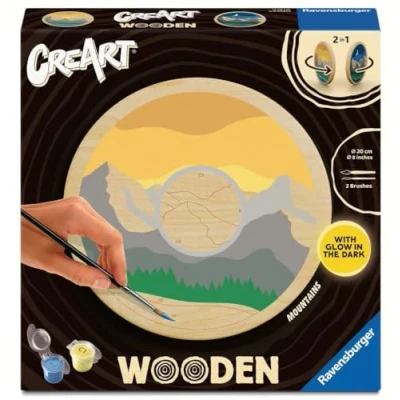 CREATIVE ACTIVITY FOR ADULTS This complete kit allows you to create a beautiful painting on WOOD thanks to paint by numbers. This landscape visual, painting on both sides and its round format with a diameter of 20 cm offer it a real trendy look! A cotton cord and screws are included for hanging. Everyone can be an artist with paint by numbers! Paint step by step with numbered paint fields and create a real masterpiece. You will be proud to reveal your achievement! Relaxation and relaxation Away from the screens, painting by numbers invites you to relax and disconnect from your daily life by promoting concentration and reducing your stress. It is an ideal activity in rainy weather, after a working day or during weekends Personalised decoration or gift Once the painting is painted, it becomes a trendy decoration to hang in your home (cotton cord and 3 screws with metal eyelets included). You can also give it to your loved ones as a personalized work of art made by yourself! EVERYTHING INCLUDED: 1 round basswood board (diameter 20 cm), 15 water-based acrylic colours in resealable cups, 2 brushes, 1 cotton cord, 3 screws with metal eyelets, 6 wooden beads, 1 colour palette, 1 model and instructions. Acrylic paints are odourless, do not require mixing and are quick drying., Manufacturer: Ravensburger