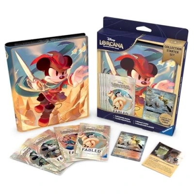 ADVENTURES AWAIT: Explore the enchanting world of Lorcana in this extraordinary trading card game. Discover stunning original artwork that beautifully captures the essence of beloved Disney characters, providing an immersive experience like no other. EASY TO LEARN, ENGAGING TO PLAY: Dive into trading card games with a welcoming gameplay experience designed for casual players and newcomers that also offers strategic depth to satisfy competitive players. Disney Lorcana can be played by 2 or more players ages 8 and up and takes about 10 minutes per player. A TREASURE TROVE OF ART: Discover over 200 breathtaking pieces of original Disney art in every set, making it the largest collection of original Disney artwork ever assembled in a single product. COLLECT, TRADE, AND CHALLENGE: Embark on an epic journey to build your ultimate deck, collect rare cards, and challenge fellow Disney enthusiasts. HIGH-QUALITY COMPONENTS: 4x Fabled Booster packs each with 12 randomized cards. 1x Mickey Mouse card portfolio, 1x "Glimmer" Tinkerbell promo card, 1x Collectors Guide, Manufacturer: Ravensburger