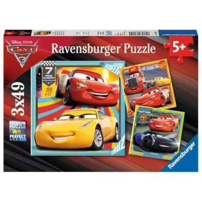 A set of 3 bright and colourful puzzles featuring your favourite characters from the new hit film Cars 3 High quality 3 x 49 piece cardboard jigsaw puzzles The finished puzzles measure 17 x 17cm when complete Suitable for ages 5 years and up. Made from strong premium grade cardboard, with linen finish print to minimize glare on puzzle image., Manufacturer: Ravensburger