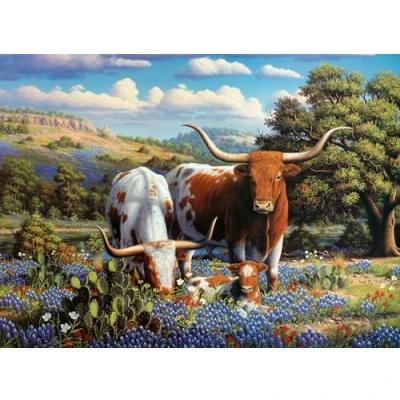 LONGHORNS - Immerse yourself in the rustic beauty of the American countryside with our captivating 500-piece puzzle, "Longhorns" Step into a scene straight out of the heartland as a family of majestic longhorn cattle grazes peacefully in a vast, sun-drenched field. Each piece of this puzzle brings you closer to the serene beauty of rural life, from the intricate details of the longhorns' coats to the tranquil atmosphere of the countryside. PREMIUM QUALITY - Ravensburger puzzles use an exclusive, extra-thick cardboard combined with fine linen structured paper to create a glare-free puzzle image and give you the best experience possible. Our 500 piece jigsaws are crafted with premium quality materials and measure 49x36cm when complete. Fully complies with all necessary UK and EU testing standards. BESTSELLING PUZZLE BRAND WORLDWIDE - With over 1 billion puzzles sold, Ravensburger jigsaw puzzles make ideal gifts for women, men, adults, kids age 10 years up and fit perfectly on our puzzle board. FSC CERTIFIED - This product is made of FSC-certified and other controlled material. By choosing this product, you are supporting responsible management of the world's forests. POSITIVELY PUZZLING - From fun family times together to long term health benefits and day-to-day mindful moments, jigsaw puzzles make a great birthday gift or Christmas present., Manufacturer: Ravensburger