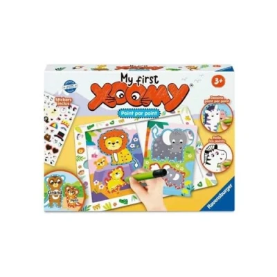 DRAWING POINT BY POINT: Your child starts by drawing the contours of animals following dots, making the process simple and intuitive. Then it connects the dots to reveal the animal's complete shape, thereby developing its coordination and concentration. Finally, he can color his drawing, adding a personal and creative touch. SAFARI THEME: Dive into a colorful safari with My First Xoomy! Your child will discover and draw all the emblematic animals of the savannah: elephant, rhino, lion, leopard, giraffe, zebra, monkey, crocodile, meerkat, chameleon, turtle. The modern and colourful illustrations are perfect for capturing the imagination of the little ones. EDUCATIONAL AND Evolving Game: With the two stencils sizes (A5 and A6), My First Xoomy grows with your child. Smaller stencils add difficulty for an ongoing challenge. Each stencil depicts a mother animal and her baby, helping your child understand notions of space and dimension in a playful and progressive way. Stickers for more fun: Once the drawing is finished, the child can add fun stickers to bring their creations to life. By sticking and peeling the stickers, he personalizes his drawings while improving his fine motor skills. It is a fun way to make each work unique and full of emotions. FUN DETAILS: All of our stencils are designed with special cutouts like elephant ears, zebra stripes, or crocodile scales. Discover the contents of My First Xoomy: 1 drawing board, 4 A6 stencils, 7 A5 stencils, 1 felt-tip pen, 8 white sheets and an illustrated instruction!, Manufacturer: Ravensburger