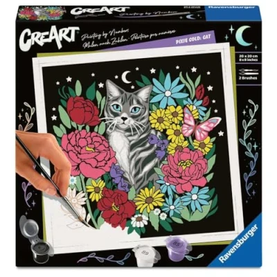 Unpack and recharge your energy with the CreArt - paint by numbers complete sets from 12 years The path to inner peace and relaxation is very easy: the painting fields are numbered and are gradually coloured with the matching acrylic paint The exact specifications guarantee a perfect painting result for a great DIY project and a trendy decoration The colourful cat motif has been drawn by the German artist Pixie Cold exclusively for Ravensburger It is ideal as a gift for teenagers from 12 years and adults The painting set contains ready-mixed acrylic paints in resealable and numbered bowls, a sturdy painting board in the format 0.30 cm x 20.00 cm, gloss varnish for finishing, a brush and instructions (English language not guaranteed). The high-quality acrylic paints dry quickly, are water-based, odourless and do not require a brush cleaner, Manufacturer: Ravensburger