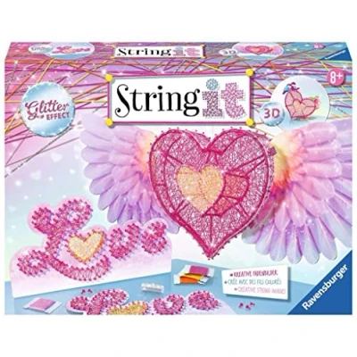 With Ravensburger String it, children aged 8 and over make colourful thread images and create three-dimensional artworks: simply press the pins into the motif template and connect with colourful and glittering yarn - the ideal activity for children String Art is on trend, unlike creating classic nail pictures, little young artists use completely safe pins instead of sharp nails and a squeezing aid instead of a hammer The glitter effect and the pins give the 3D heart a romantic charm, which makes this creative set the ideal gift for girls from 8 years - whether as a Christmas gift, Easter gift or birthday gift International products have separate terms, are sold from abroad and may differ from local products, including fit, age ratings, and language of product, labeling or instructions., Manufacturer: Ravensburger