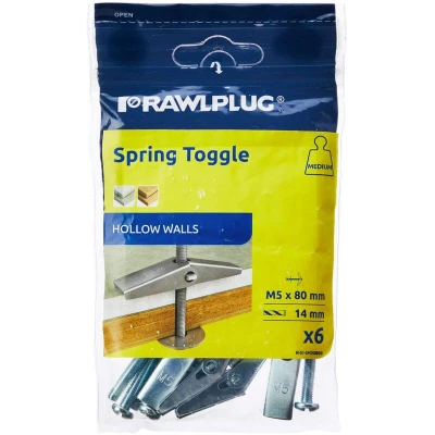 JoybuyThe Rawlplug Spring Toggle M5 x 80mm Pack of 6 is ideal for securely fixing large fixtures to cavity walls and ceilings with low structural strength, such as plasterboard and lathe and plaster. Easy to install without special tools, it spreads loads for extra security and durability.