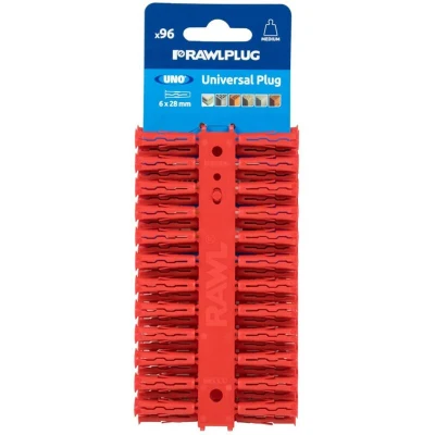 JoybuyRawlplug Red UNO® Plugs 6 x 28mm (Card 96) are universal wall plugs designed for secure fixings in concrete, brickwork, stone, blockwork, and plasterboard. Featuring a unique expansion design and anti-rotation features, they provide reliable grip for shelving, cabinets, cable trays, and more.