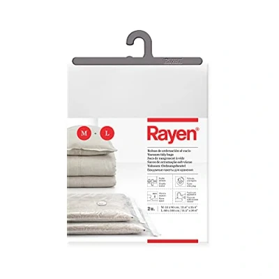 Set of Rayen vacuum storage bags for clothes, blankets and other textiles. With this vacuum storage bag you save space and protect your clothes from smells, dust, insects and moisture. This vacuum storage bag has a double seal; a stopper valve and a vacuum seal. Ideal for travel - with this vacuum storage bag you will save space in your luggage. Set of 2 vacuum bags: M & L This vacuum storage bag is available in three different sizes: small, medium and large, so you can choose the one that best suits your needs