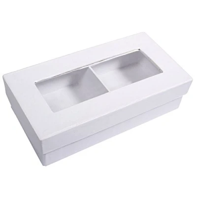 Practical packaging for gifts, white box with two compartments: L/W/H 16.5 x 8.5 x 4.5 cm, cut in the lid, 14 x 6 cm, with PVC foil For easy and quick wrapping of gifts Fill in coloured or white silk paper into two compartments when needed, and display the gift effectively A beautiful gift band gives everything the finishing touch Simple white box on itself, but can be painted, glued, e.g. shiny stones, stickers etc. can be glued with