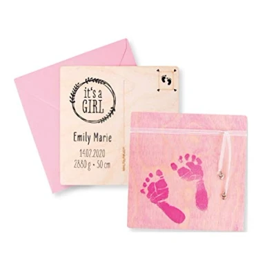 This baby hand and foot print craft kit contains washable finger paint in pink, 4 wooden postcards in the size 14.8x14.8x0.3cm, 4 Envelopes in the size 16x16cm, and 1 sponge brush The paint is washable at 30°C and contains a bitter child safety additive to prevent accidental consumption. The postcards are made from sustainable wood Make special birth announcement cards for family and friends. Use the included skin safe paint and sponge brush to create adorable baby hand prints or footprints. Highlight it with washi tape, glitter glue, stickers, ribbons, and more for a personal touch Add the important details with acrylic markers or transfer phrases, letters and numbers with stamps or stencils. Create additional designs with decoupage or a woodburning pen The Postcard is designed to send by post within the UK at the standard rate. It weighs 48g, weight without the additional decorative pieces you might add. But basically, you can send your handmade card all over the world