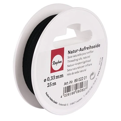 Stringing Silk, Jewellery Thread, Black, Spool 25 m, 0.33 mm Diameter Material: 100% polyamide This yarn knots well, is extremely tear-resistant, stable, does not fray or knots, ideal for many jewellery projects Also suitable for bead weaving with the bead weaving frame Fine stringing thread, ideal for delicate jewellery making and beading crochet