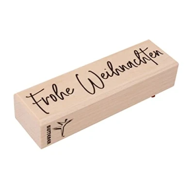 The permanently mounted design-layer of this rubber stamp features the phrase: Frohe Weihnachten. The rubber has a deeply etched image for a clear and crisp stamp impression Add the lovely Christmas themed phrase to your seasonal papercraft projects like Christmas cards, invitations for your Christmas party, gift tags, name cards for stockings, place cards, and more. The craft stamp works perfectly on paper, cardstock, fabric, wood, and more Choose your favourite ink pad for your craft creations. For a dazzling look use the rubber stamp with metallic or glitter ink. For a natural or vintage look try chalk-finish ink colours. Sprinkle embossing powder over the inked area to create a raised image Easily personalise gift boxes, gift wrapping paper, or gift envelopes. Make the stamped image stand out and highlight it with watercolour pens or embellish it with ribbons, seasonal stems, little bells, and more Size wood base 3x10cm, Stamped image size approx. 5mm smaller than the base