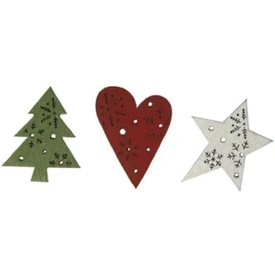 6 Pack Green Tartan Print Wooden Christmas Tree Decoration Star Heart Bauble Hanging Traditional