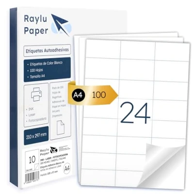 Raylu Paper ® White Self Adhesive Labels for Printing, A4 Sheets Inkjet Printers, Laser and Copiers, 24 per Sheet (70 x 37 mm)