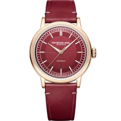 RAYMOND WEIL pays tribute to horological heritage while celebrating refined simplicity. This Analogue watch is equipped with a Luminous Hands and has a Swiss Made Movement High quality Red Leather strap, measuring 21 cm in length and 21 mm in width, with a Buckle Case diameter: 39.5 mm,case thickness: 9 mm, case colour: Rose Gold and dial colour: Red Water resistant: 5 bars-Weight: 58 g The watch is delivered in an original gift box and has a warranty of 2 years
