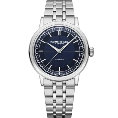 RAYMOND WEIL’s millesime collection pays homage to horological tradition with vintage charm and modern refinement. This Analogue watch is equipped with a Luminous Hands and has a Swiss Made Movement High quality Silver Stainless steel strap, measuring 21 cm in length and 19 mm in width, with a Deployment clasp Case diameter: 39.5 mm,case thickness: 9 mm, case colour: Silver and dial colour: Blue Water resistant: 5 bars-Weight: 135 g The watch is delivered in an original gift box and has a warranty of 2 years