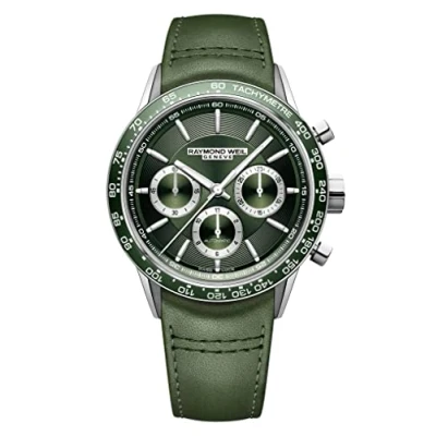 RAYMOND WEIL proudly presents the freelancer 7741, a tri-compax chronograph blending technical mastery with refined style. This Chronograph watch is equipped with a Stop Watch , Luminous Hands , Tachymeter , Screw Down Crown and has a Swiss Made Movement High quality Green Leather strap, measuring 21 cm in length and 21 mm in width, with a Deployment clasp Case diameter: 43.5 mm,case thickness: 14 mm, case colour: Silver and dial colour: Green Water resistant: 10 bars-Weight: 118 g The watch is delivered in an original gift box and has a warranty of 2 years