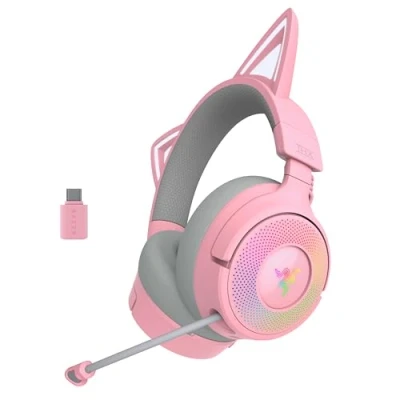Stream and Game Reactive Kitty Ears - Powered by Razer Chroma RGB: With 16,8M colors and endless lighting effects, show off your style with kitty ears and earcups that dynamically react to live events and sync with 300+ games and 500 devices across 50+ partners. 3 Modes of Connectivity - Razer HyperSpeed Wireless | Bluetooth | USB: From your PC to your console to your phone, enjoy full audio immersion wherever you game. Go wireless with ultra-fast 2,4 GHz or Bluetooth 5.3, or stay plugged in via USB for unlimited play. Retractable Razer HyperClear Super Wideband Mic - for high-definition, pro-level voice quality: With a wider frequency range, this next-gen retractable mic picks up all the details in your voice, so that everything you say shines through clearly and naturally. Razer TriForce Titanium 40 mm Drivers - for powerful, lifelike audio: Our patented 3-part driver design brings every sound to life with crisp highs, smooth mids, and deep, punchy lows that don’t muddy—so you get pure audio magic for an ultra-immersive experience. THX Spatial Audio - for realistic positional sound: With our advanced 7.1 surround sound, turn up the intensity with true-to-life acoustics that optimize your game’s sound design and put you at the heart of the action. Protein Leatherette with Memory Foam Ear Cushions - for all-day comfort: Stay comfy and locked in - The soft, cushioned seal hugs your ears for a comfortable fit while improving sound isolation, keeping you fully immersed and free from distractions.