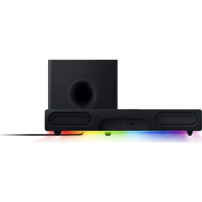 Multi-driver PC Soundbar and Subwoofer for crisp, clear trebles and deep, punchy bass. Packed with 2 full-range drivers, a down-firing subwoofer, and more, our all-in-one sound system is designed to provide full-range, high-fidelity sound that elevates your audio experience. THX Spatial Audio for a wide, true-to-life soundstage. Our advanced 7.1 surround sound delivers audio with pinpoint accuracy, allowing for a more realistic and detailed soundstage that makes your movies, games, and music truly come alive. Compact Desktop Form Factor for room-filling sound and minimal footprint. The compact soundbar fits perfectly beneath your monitor to keep your desktop clutter-free, while detachable rubber feet keep it angled towards you for minimal audio obstruction. Bluetooth 5.2 for seamless PC and mobile connection. Enjoy smooth, stutter-free sound with a low-latency Bluetooth connection, as you switch from your PC to as many as 8 other devices conveniently paired via the Razer Audio App. Powered by Razer Chroma RGB for greater customization and immersion. With 18 lighting zones, countless patterns, dynamic in-game lighting effects—experience full RGB customization and deeper immersion with the world’s largest lighting ecosystem for gaming devices.