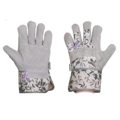 Lavender and Green Leaf Print in Size 8 (medium) Why Choose Me? My suede fingertips give you extra protection and I'm so pretty! I have an extended cuff to help prevent soil from falling into the glove and an elasticated wrist for better fit The suede on the palms is extended to the thumbs, fingertips, and over the back of the hand for extra protection. Back: 100% Cotton/Palm:100% Split Leather/Cuff:100% Polyester