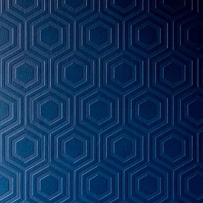 A luxury textured vinyl with a retro geometric design - six sided hexagon shapes in a honeycombe all over effect. A paintable white design - paint it the colour of your choice. Image shows paper painted a deep blue. Pattern repeat 16cm / 6 inches approx straight match.